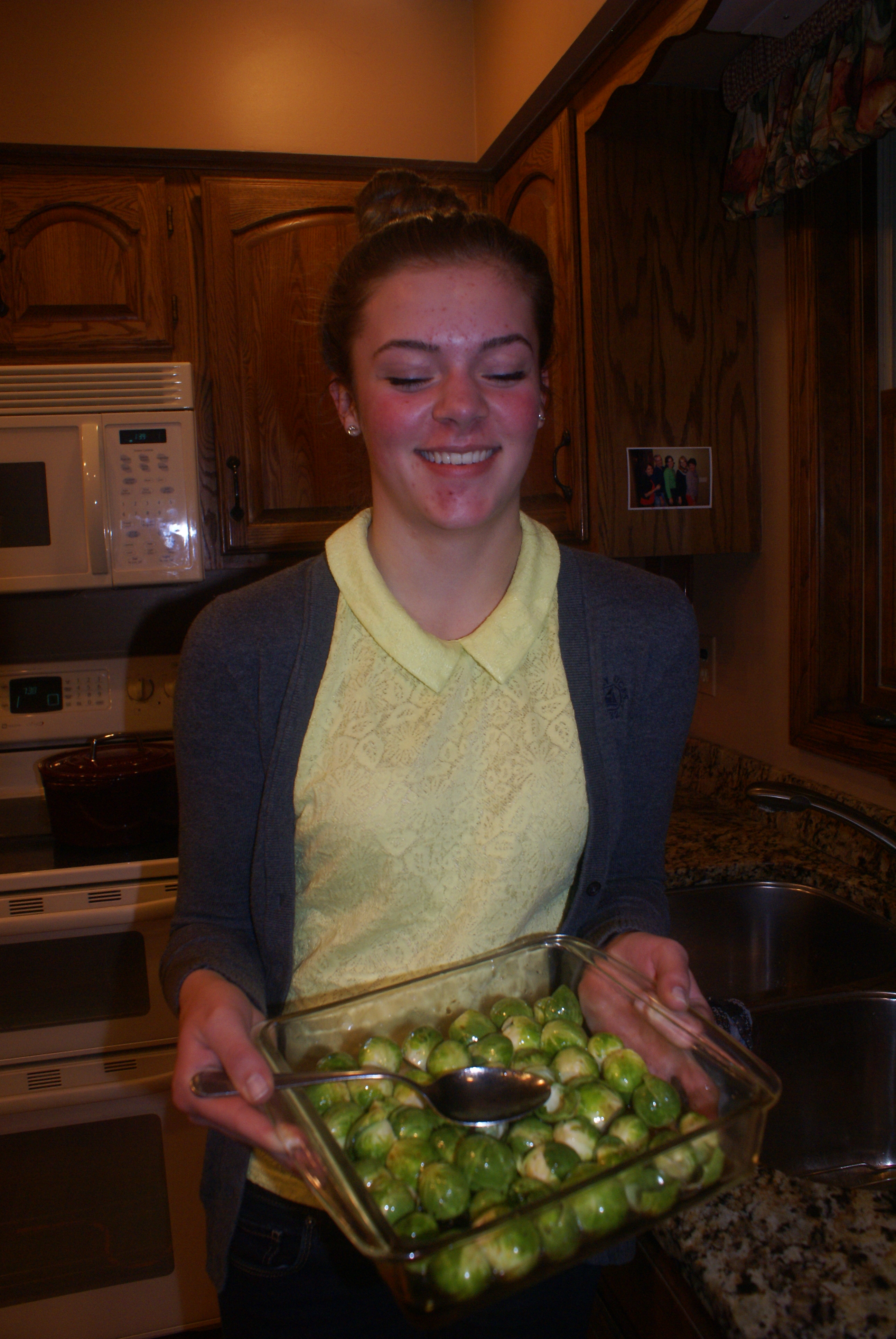 “My skin is crawling at the thought of Brussels sprouts!” Why do Brussels sprouts scare people? Because people don’t know how to cook them. My latest favorite recipe is to roast them with maple syrup. What food wouldn’t taste better with a little maple syrup on it? I served these green babies at my St. Patrick’s day party and I think (fingers crossed) I may have some Brussels sprout converts. Give this recipe a try. To turn my guests on to them I used much more maple syrup (4 tablespoons) than I would normally for our family. I think it worked like a charm!