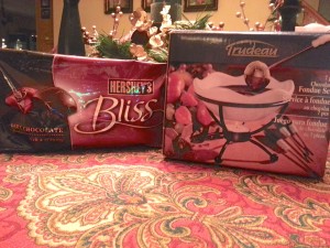 - Chocolate Fondue Pot with a Bag of Dark Chocolate …Recipe: 8 Hershey Bliss and ¼ cup whipping cream melted.