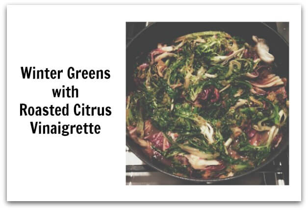 Using a spoon, remove flesh from citrus and place in a blender. Pour in any juice from the baking pan. Add honey and 2 Tbsp olive oil and blend until smooth. Place vinaigrette in a large skillet over medium-low heat. Add kale and stir until lightly wilted, about 3 minutes. Add radicchio and frisée, and toss until coated and warm. Divide among plates and serve warm. Serves 4-6.
